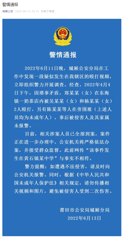 荔枝新闻讯 “城厢公安”微信公众号13日晚通报,经查,2022年4月4日下午,因琐事矛盾,郑某某(女)在东海镇一奶茶店内被吴某某(女)和杨某某(女)2人殴打,另有陈某某等人在旁围观(上诉人员均为未成年人)。事后被侵害人及其家属未报警。目前相关涉案人员已全部到案,案件正在进一步办理中。
