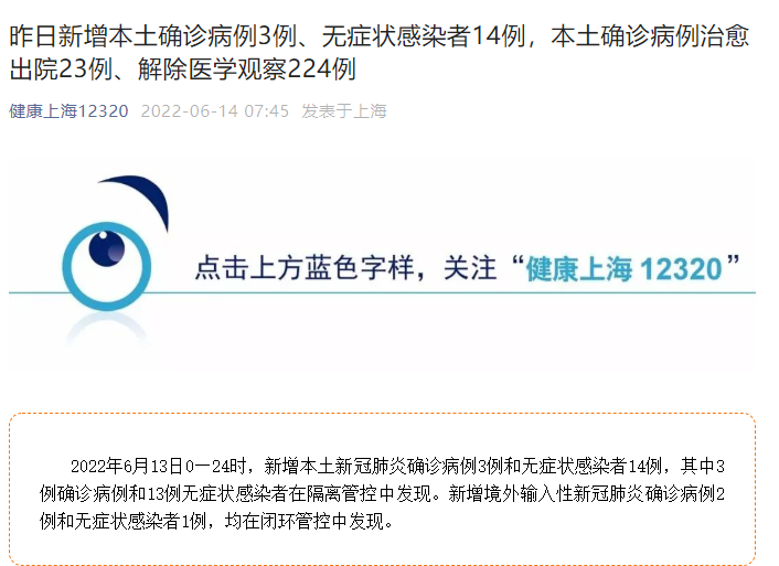荔枝新闻讯 据上海市卫健委今早(6月14日)通报:2022年6月13日0—24时,新增本土新冠肺炎确诊病例3例和无症状感染者14例,其中3例确诊病例和13例无症状感染者在隔离管控中发现。新增境外输入性新冠肺炎确诊病例2例和无症状感染者1例,均在闭环管控中发现。