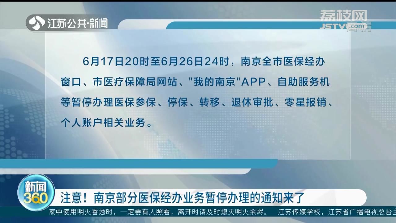 6月17日20时至6月26日24时,南京全市医保经办窗口、市医疗保障局网站、“我的南京”APP、自助服务机等暂停办理医保参保、停保、转移、退休审批、零星报销、个人账户相关业务。