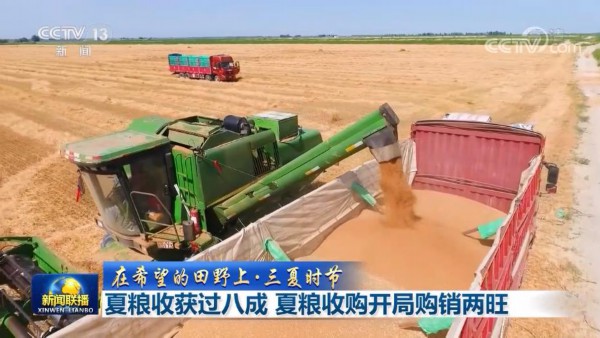 央视网消息(新闻联播):农业农村部今天(6月13日)发布的小麦机收进度显示,全国已收获小麦面积2.47亿亩,收获进度81.2%。随着夏粮收获进入尾声,各地陆续开秤收购新粮。国家粮食和物资储备局最新调度显示,今年小麦普遍质优价高,湖北、安徽、江苏等地小麦已集中上市,河南北部、山东西北部地区和河北省小麦收购正在展开,预计夏粮旺季收购量为1300亿斤左右。截至6月12日,主产区新麦收购量950万吨,进度明显快于上年。