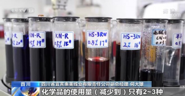 四川省宜宾惠美线业有限责任公司染色技术总监 张海:我们新型纱线改变了里面纱线的结构,它是常温染色、不需要蒸汽加热,造成它上染率非常高,只需要清洗一次就够了,节约了能源和水。