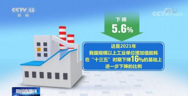 下降5.6%。这是2021年我国规模以上工业单位增加值能耗在“十三五”时期下降16%的基础上进一步下降的比例。能耗是衡量减排的重要指标,这进一步下降的5.6%里,既有坚决压减粗钢产量、淘汰落后产能的努力,也有先进技术研发突破、传统产业转型升级的步伐。