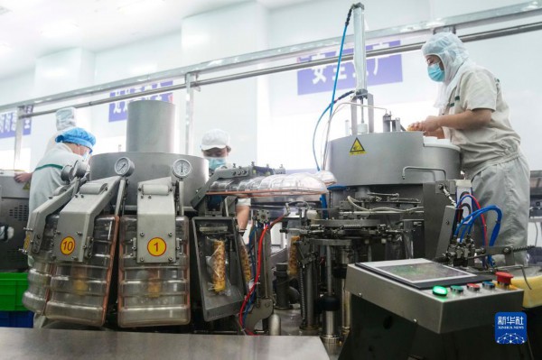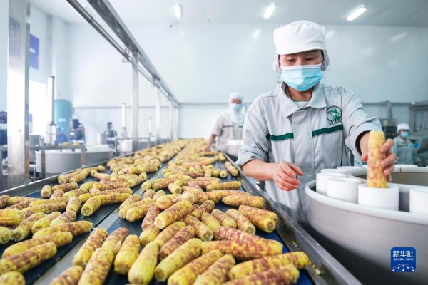 工人在吉林省农嫂食品有限公司生产车间内加工鲜食玉米(6月6日摄)。新华社记者 许畅 摄