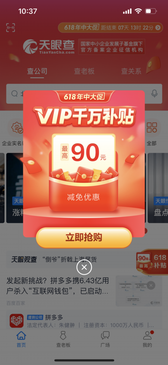 兵法有云“知己知彼,百战不殆”,在波谲云诡的商场中,一个帮助我们了解合作伙伴、交易对象的商业查询工具就显得尤为重要。近日,天眼查618年中大促活动火热开启,为用户带来更丰富、更超值的权益体验。