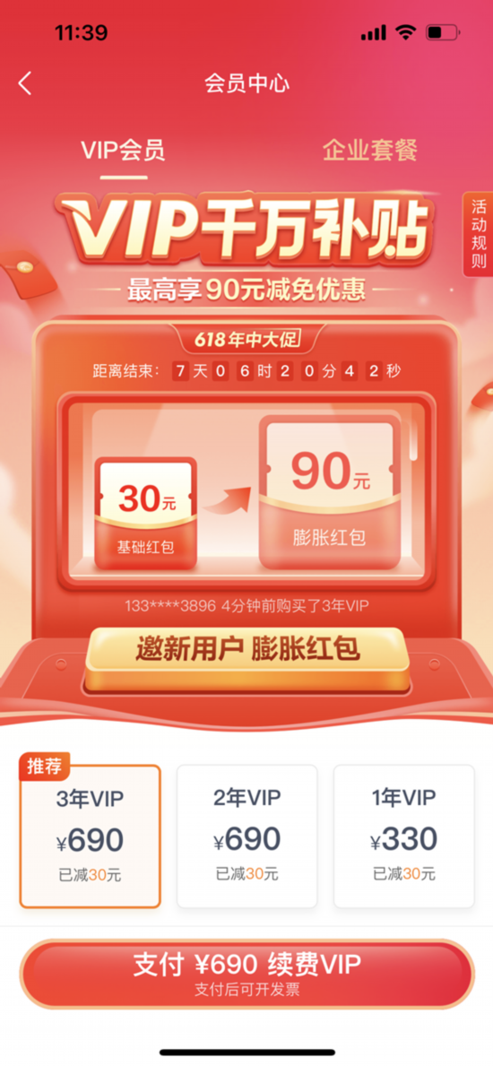 即日起,用户进入天眼查APP首页便可随机获得减免优惠券一张;通过分享邀请好友助力,还可膨胀红包金额,最高可获得90元VIP减免。