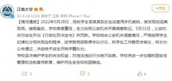 荔枝新闻讯 据江南大学微博6月14日发布情况通报:2022年5月28日,我校学生李某某到女生浴室用手机偷拍,被发现后逃离现场。接报案后,学校高度重视,全力协同公安机关开展调查取证。5月31日,公安机关对该生开出《行政处罚决定书》并罚款。学校结合公安机关调查情况,严格按照学生纪律处分相关规定和程序,经学院党政联席会议讨论,校学生工作委员会审议,校长办公会通过,决定给予该生开除学籍处分。