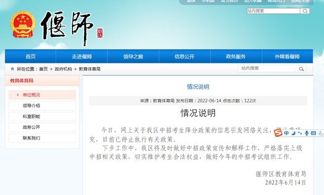 今日,网上关于我区中招考生降分政策的信息引发网络关注,经认真研究,目前已停止执行有关政策。
