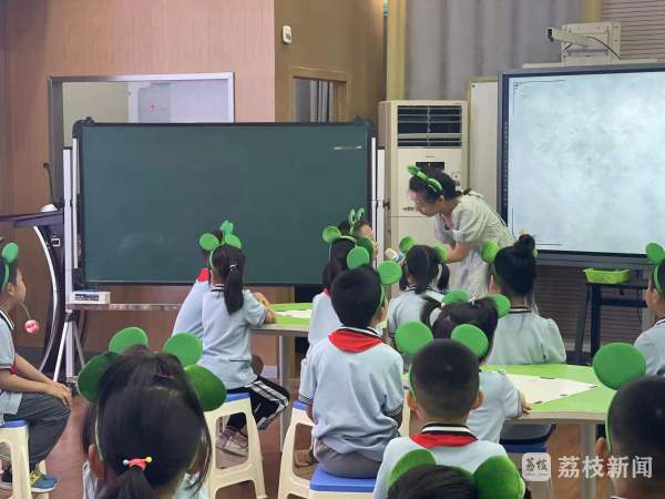 而在小学一年级的课上,老师通过即将到来的父亲节为切入点,引导孩子们学习一首歌曲送给爸爸。孩子们扮演歌曲里的青蛙妈妈和青蛙宝宝,以不同声部组成"青蛙合唱队"完成歌曲;老师们还带来真实的荷叶,让孩子们看一看、摸一摸、闻一闻,并根据荷叶特点进行夏日荷塘的绘画。两场以夏日为主题的艺术综合活动,展现了小学和幼儿园在教学上的差异。