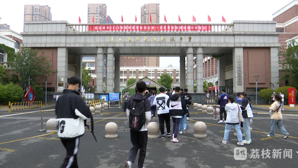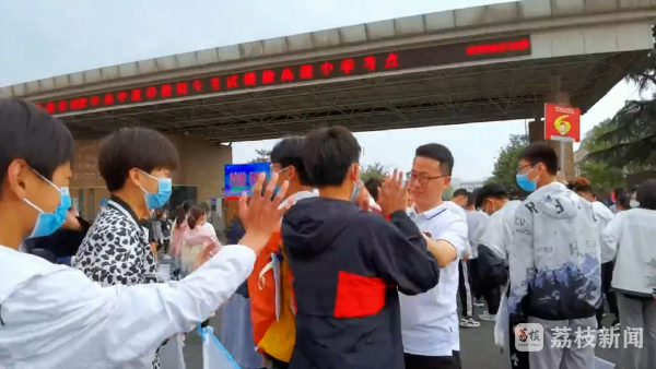 在赣榆高级中学和赣榆第一中学等考点,考生们乘坐送考车辆统一抵达。进入考点前,送考老师和考生们击掌,为他们加油鼓劲。