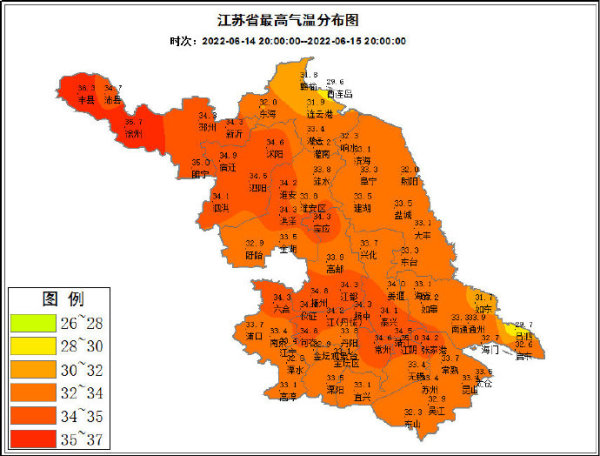 15日开始,江苏全省天气晴好,升温明显,根据江苏省气象台的统计,15日下午,全省大部分地区的气温都已经达到了30℃以上;而从16号开始,高温范围还将进一步扩大,全省大部分地区最高气温都将达35℃以上,部分地区的最高气温将冲击38-39℃,夏天回归本来的味道。江苏省气象台首席预报员助理金小霞介绍:“从16日一直到18日,我省大部地区都以晴好天气为主。从16日开始,我省沿江地区以北的最高气温将达到35℃以上,尤其是到了17、18日,我省淮北地区包括徐州、连云港、宿迁北部等地将会达到38℃左右,甚至是39接近40℃的这样一个高温天气。”