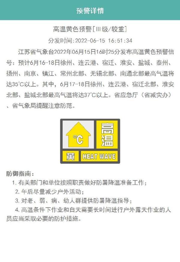 随着天气的转好,江苏迎来了蓝天白云的美景,阳光也让升温迅猛。今天(6月15日)下午,江苏省气象台发布高温黄色预警信号。预计从16日开始,江苏将加速进入升温通道,17~18日期间,部分地区的最高气温可能会冲击40℃,本周剩下的时间都将在高温高湿中度过了,大家一定要做好防暑降温工作!