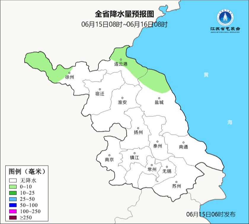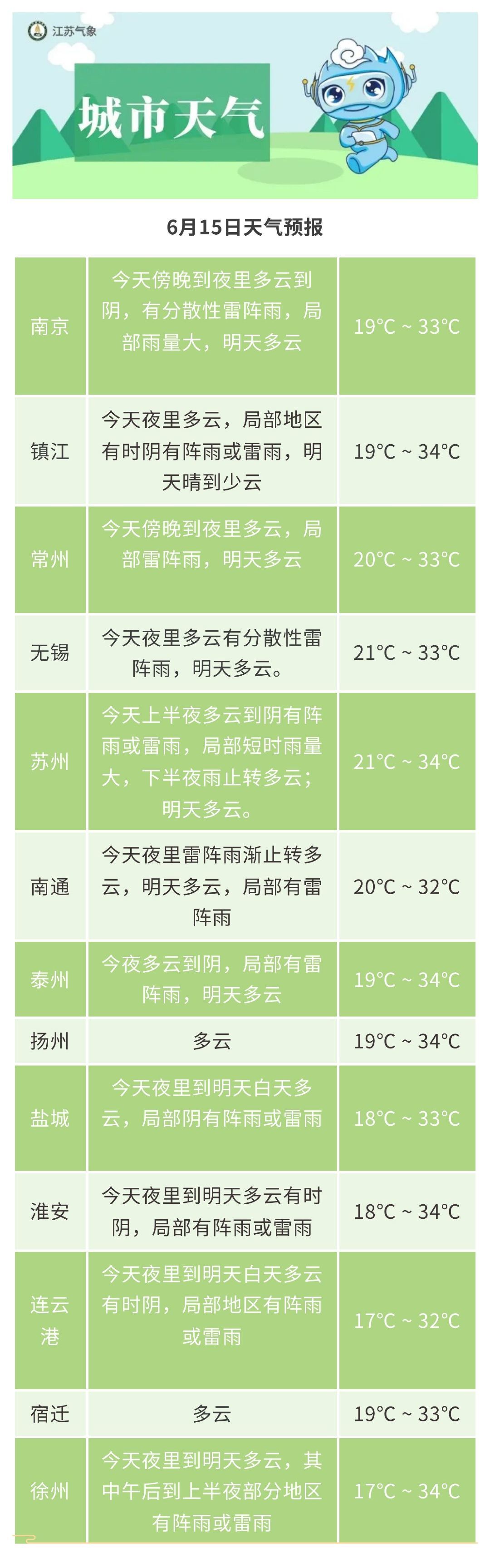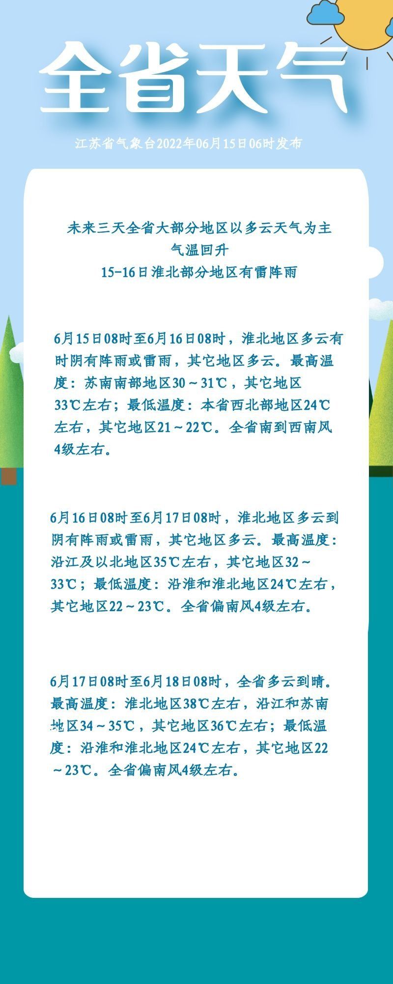 6月15日08时至6月16日08时,淮北地区多云有时阴有阵雨或雷雨,其它地区多云。最高温度:苏南南部地区30~31℃,其它地区33℃左右;最低温度:本省西北部地区24℃左右,其它地区21~22℃。全省南到西南风4级左右。