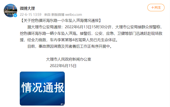荔枝新闻讯 云南省大理市委宣传部“微博大理”6月15日消息,据大理市公安局通报:2022年6月13日15时30分许,大理市公安局接群众报警称,挖色镇环海东路一辆小车坠入洱海。接警后,公安、应急、卫健等部门迅速赶赴现场救援,经全力施救,车内李某某等4名驾乘人员已无生命体征。