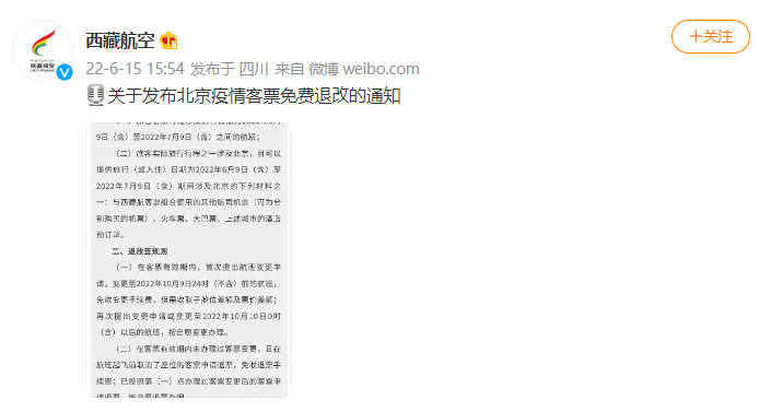 荔枝新闻讯 “西藏航空”微博6月15日消息,为配合做好疫情防控工作,协助旅客做好客票退改服务,依据市场变化,西藏航空公司发布涉及北京进出港航班的国内客票退改方案。