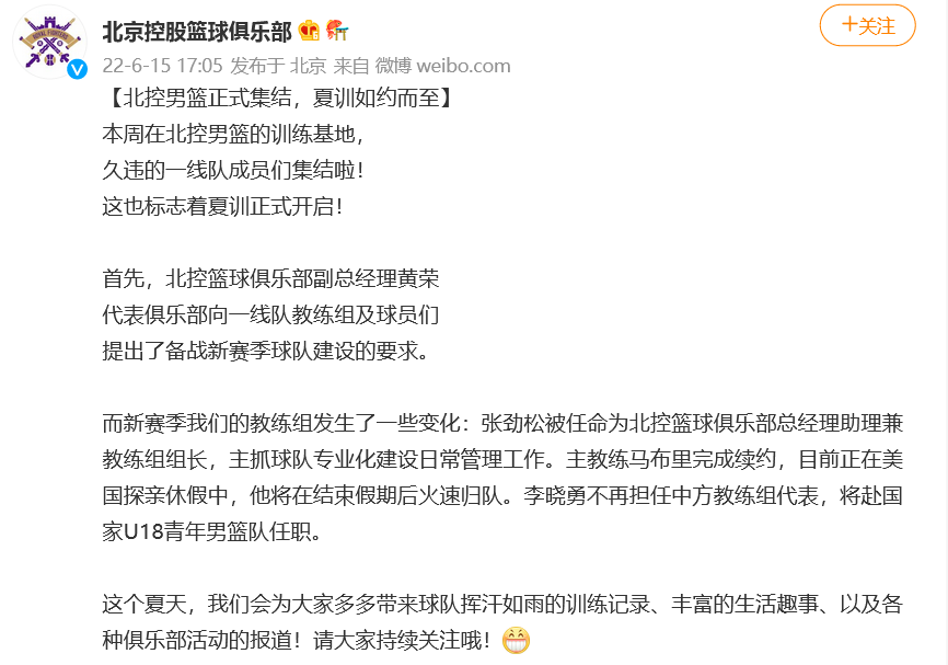 荔枝新闻讯 据北京控股篮球俱乐部官方微博消息,新赛季球队的教练组发生了一些变化:张劲松被任命为北控篮球俱乐部总经理助理兼教练组组长,主抓球队专业化建设日常管理工作。主教练马布里完成续约,目前正在美国探亲休假中,他将在结束假期后火速归队。李晓勇不再担任中方教练组代表,将赴国家U18青年男篮队任职。