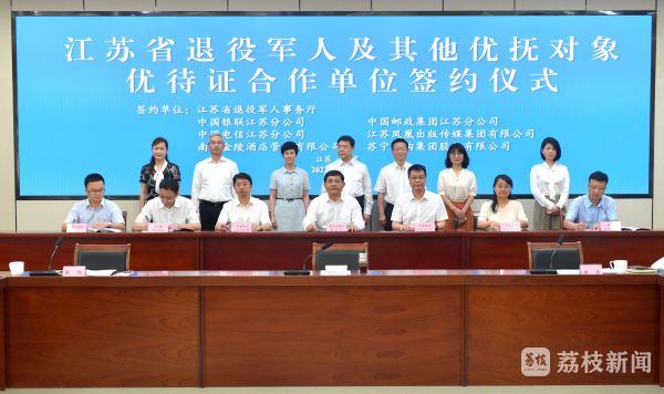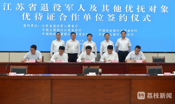签约仪式上,江苏省退役军人事务厅与中国工商银行江苏省分行、中国农业银行江苏省分行、中国邮政储蓄银行江苏省分行、中国光大银行南京分行签署了《江苏省退役军人及其他优抚对象优待证合作协议》。与中国银联江苏分公司、中国邮政集团江苏省分公司、中国电信江苏分公司、江苏凤凰新华书店集团有限公司、南京金陵酒店管理有限公司、苏宁易购集团股份有限公司签署了《江苏省拥军优抚合作协议》。根据协议内容,合作单位将为江苏省持证对象提供个性化优待服务。