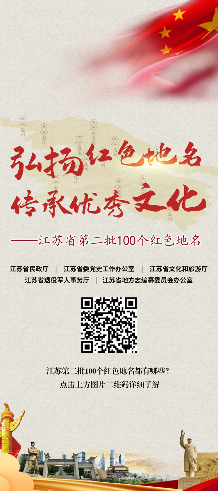 我苏网讯 为加强红色地名文化保护,充分发挥红色地名在印证历史、激励后人、服务经济社会建设与发展中的重要作用。在去年首次推选出具有重大历史价值的全省100个红色地名基础上,今年初,江苏省民政厅、省委党史工作办公室、省文化和旅游厅、省退役军人事务厅、省方志办联合开展征集宣传全省第二批红色地名活动,持续挖掘具有深厚红色文化内涵和较高传承弘扬价值的红色地名。经广泛征集、部门会商、专家论证和研究确定,日前,江苏省第二批100个红色地名正式向社会发布。