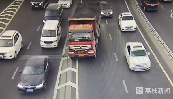 6月4号傍晚,正值晚高峰期间,双桥门立交上,一辆红色黄牌大货车夹在车流中缓缓行驶。在前往应天大街高架分道口处,该车放慢速度试图变道,引得周边小车纷纷降速避让。最终,这辆黄牌大货车强行从导流线上压过,挤上了应天高架主线行驶。南京市公安局交通管理局机动大队治安中队民警李琼说:“大型货车整体质量较大,驾驶盲区多,机动性较差,违法驶入高架桥的事故隐患和安全危害较大。”