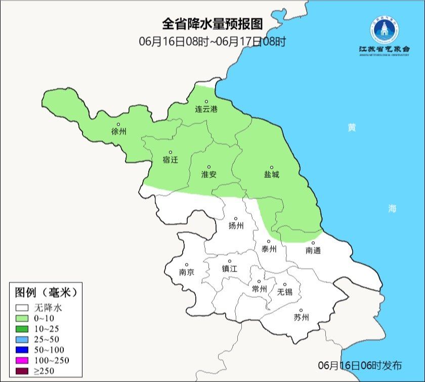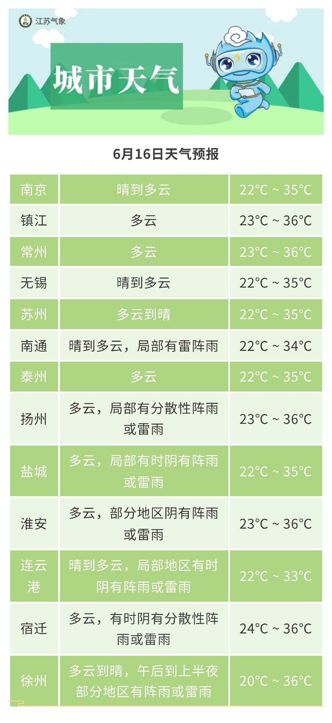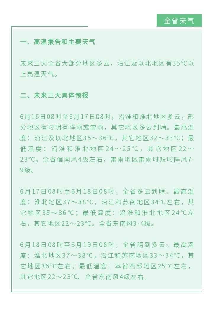 6月16日08时至6月17日08时,沿淮和淮北地区多云,部分地区有时阴有阵雨或雷雨,其它地区多云到晴。最高温度:沿江及以北地区35~36℃,其它地区32~33℃;最低温度:沿淮和淮北地区24~25℃,其它地区22~23℃。全省偏南风4级左右,雷雨地区雷雨时短时阵风7-9级。