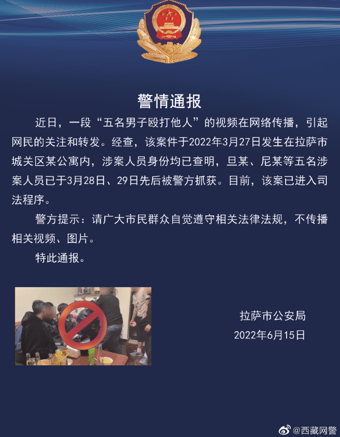 荔枝新闻讯 西藏自治区公安厅网安总队”西藏网警“6月15日消息,近日,一段“五名男子殴打他人”的视频在网络传播,引起网民的关注和转发。经查,该案件于2022年3月27日发生在拉萨市城关区某公寓内。涉案人员身份均已查明,旦某、尼某等五名涉案人员已于3月28日、29日先后被警方抓获。目前,该案已进入司法程序。
