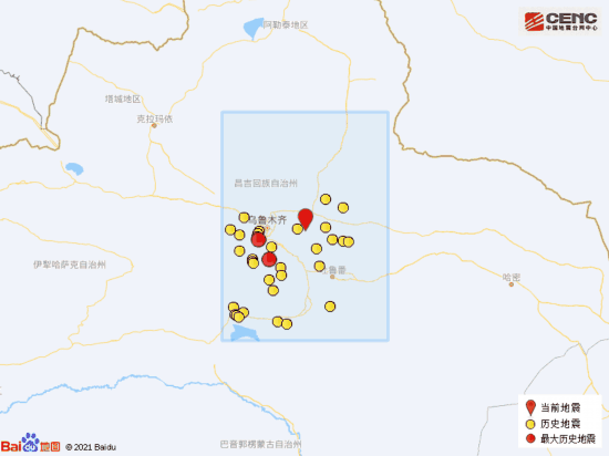 历史地震:根据中国地震台网速报目录,震中周边200公里内近5年来发生3级以上地震共35次,最大地震分别是2020年8月8日在新疆吐鲁番市托克逊县发生的4.8级地震(距离本次震中98公里)和2018年1月20日在新疆乌鲁木齐市乌鲁木齐县发生的4.8级地震(距离本次震中95公里),历史地震分布如图。