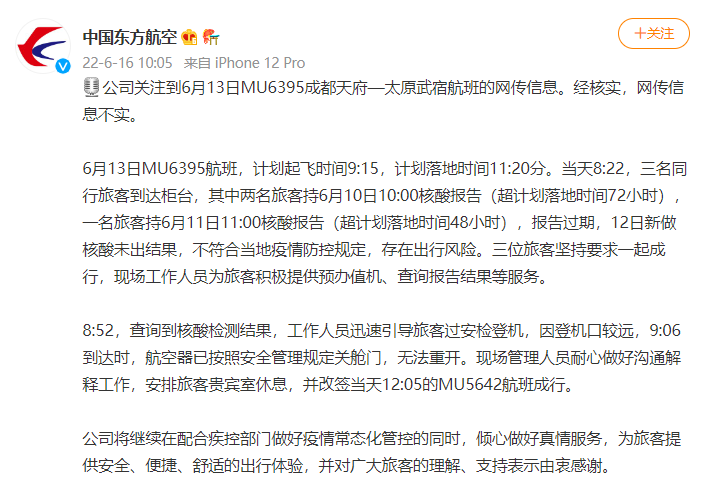 荔枝新闻讯 中国东方航空官方微博6月16日消息,中国东方航空公司表示已关注到6月13日MU6395成都天府—太原武宿航班的网传信息。经核实,网传信息不实。