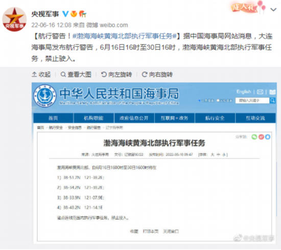 据中国海事局网站消息,大连海事局发布航行警告,6月16日16时至30日16时,渤海海峡黄海北部执行军事任务,禁止驶入。