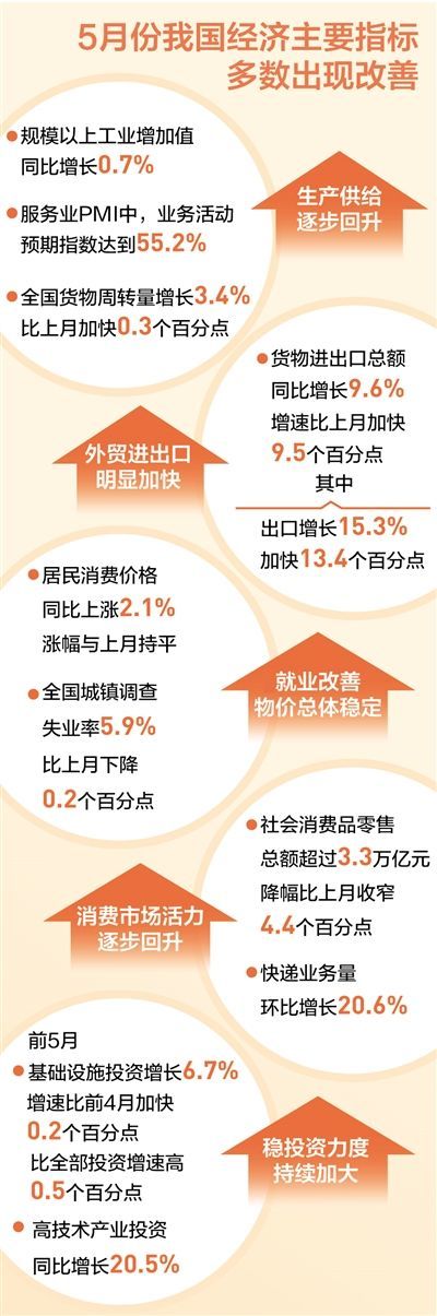 5月,我国经济运行出现积极变化,主要指标多数出现改善。