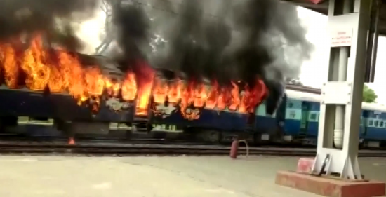 视频截图:印度示威者点燃火车车厢