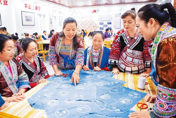 2021年11月4日,广西融水苗族自治县举办民族手工艺(苗绣)培训班,易地扶贫搬迁社区苗家小镇40多名妇女参加培训,为居家就业打下基础。图为授课老师在讲评学员绣品。 中新社发 龙涛/摄