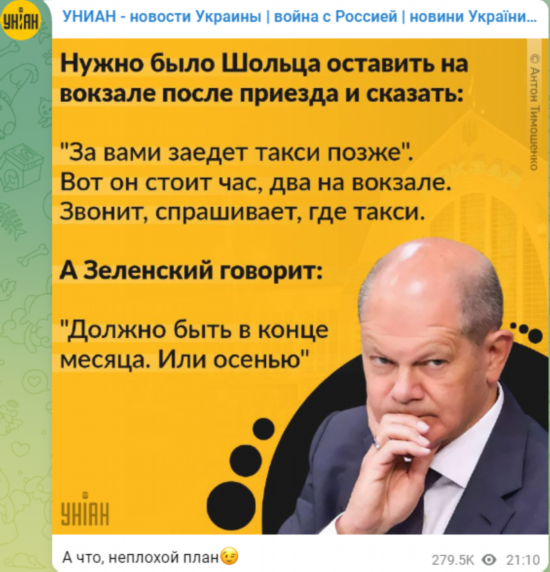 乌克兰独立新闻社16日在Telegram所发图片的右下方是朔尔茨正在思考的形象,配文中描述了一个“不错的计划”——“本应让朔尔茨抵达后留在火车站并告诉他,‘出租车晚些时候会来接您’”,“当他在火车站等了一两个小时后,会打电话询问出租车在哪儿,泽连斯基(这时)告诉他,‘(出租车)应该会在本月底或秋季到达’”。