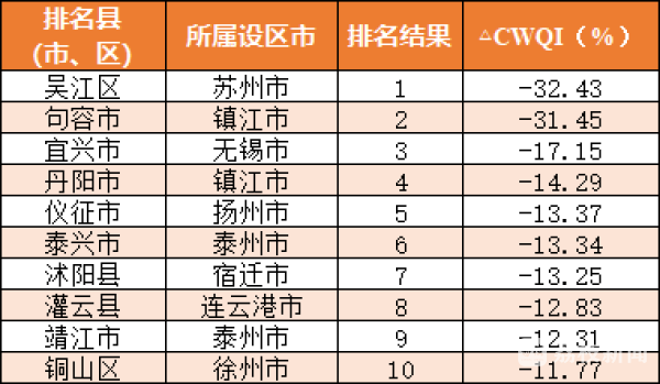 地表水环境质量改善幅度相对较快的前10位(1—10名)依次是:吴江区、句容市、宜兴市、丹阳市、仪征市、泰兴市、沭阳县、灌云县、靖江市、铜山区;