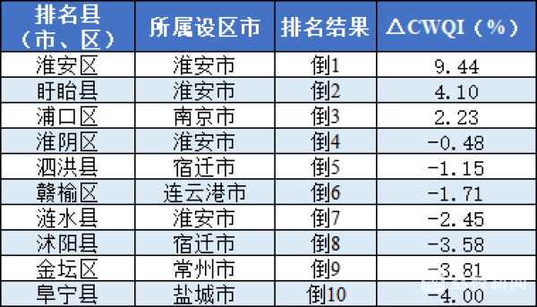 改善幅度相对较慢的后10位(倒1—10名)依次是:淮安区、盱眙县、浦口区、淮阴区、泗洪县、赣榆区、涟水县、沭阳县、金坛区、阜宁县。