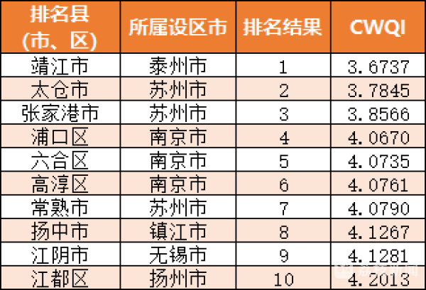 地表水环境质量相对较好的前10位(1—10名)依次是:靖江市、太仓市、张家港市、浦口区、六合区、高淳区、常熟市、扬中市、江阴市、江都区。