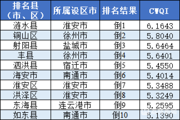 相对较差的后10位(倒1—10名)依次是:涟水县、铜山区、射阳县、丰县、泗洪县、海安市、淮安区、洪泽区、东海县、如东县。