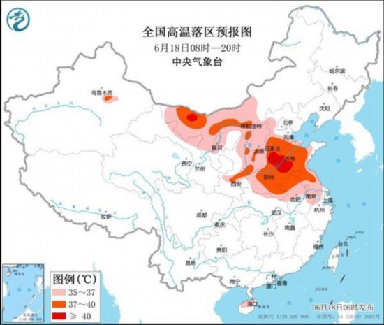 预计6月18日白天,华北西部和南部、黄淮、江淮以及西北地区东部、内蒙古西部、海南岛北部等地有35℃以上高温天气,其中,内蒙古西部、陕西关中、河北中南部、山东中西部、河南中北部和东部、安徽北部、江苏北部等地部分地区最高气温37~39℃,河北南部、河南北部、山东西部等地局地可达40℃以上。
