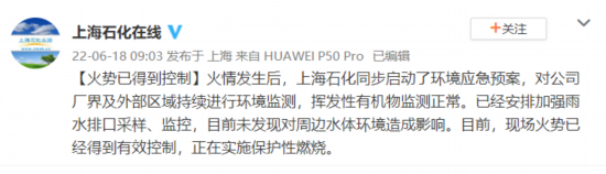火情发生后,上海石化同步启动了环境应急预案,对公司厂界及外部区域持续进行环境监测,挥发性有机物监测正常。已经安排加强雨水排口采样、监控,目前未发现对周边水体环境造成影响。目前,现场火势已经得到有效控制,正在实施保护性燃烧。