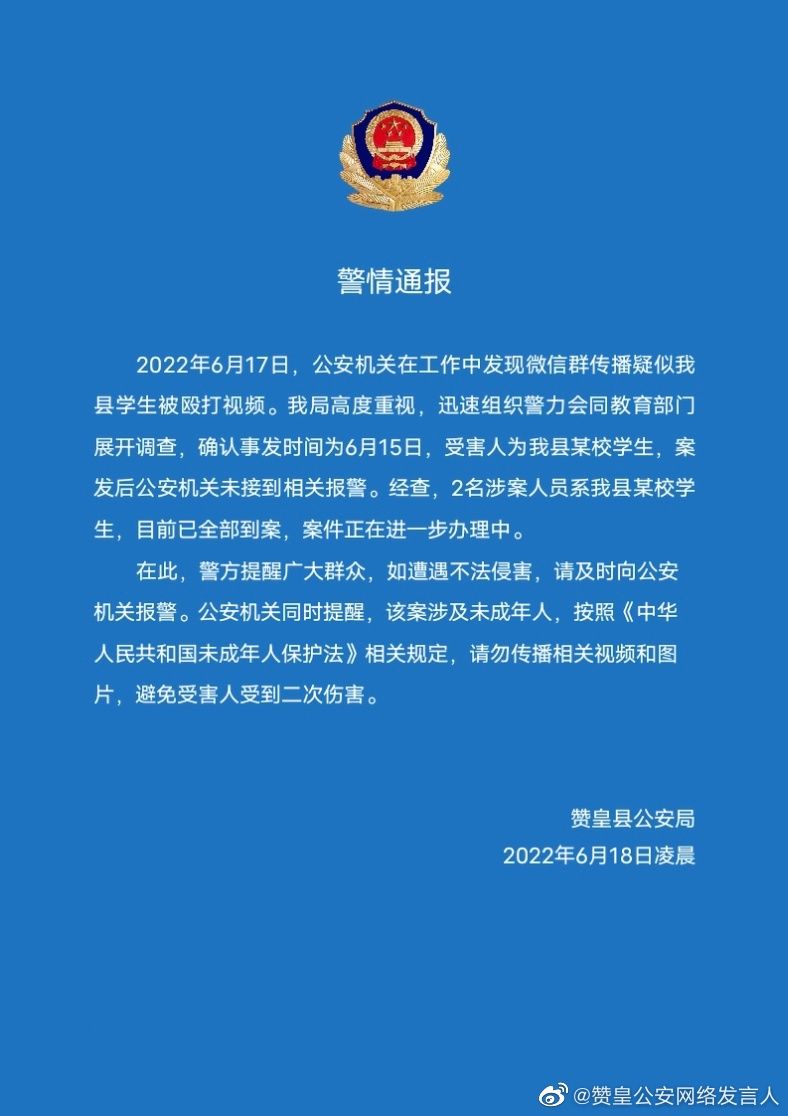 荔枝新闻讯 6月18日,@赞皇公安网络发言人 发布警情通报称,2022年6月17日,公安机关在工作中发现微信群传播疑似该县学生被殴打视频。该局高度重视,迅速组织警力会同教育部门展开调查,确认事发时间为6月15日,受害人为该县某校学生,案发后公安机关未接到相关报警。经查,2名涉案人员系该县某校学生,目前已全部到案,案件正在进一步办理中。