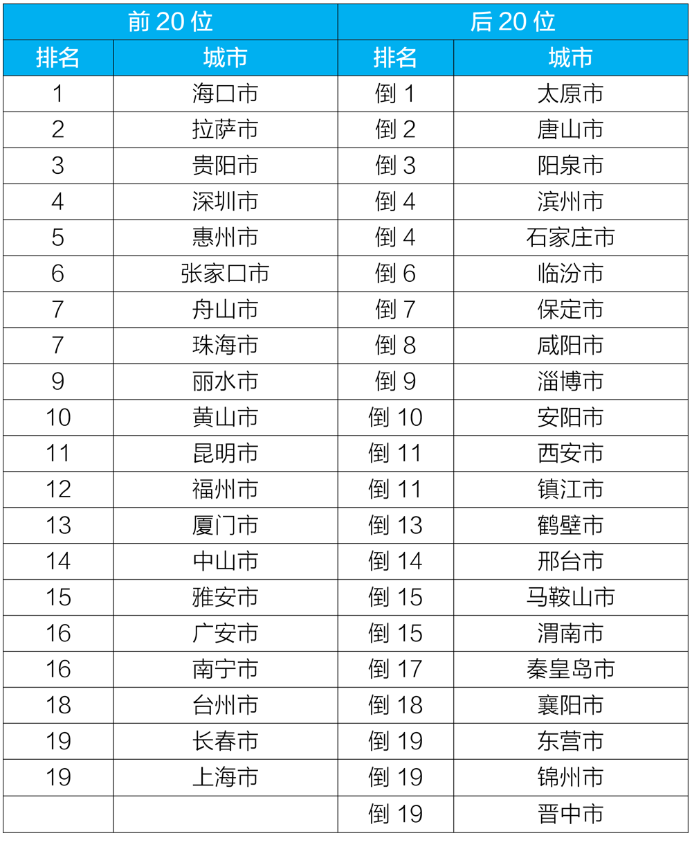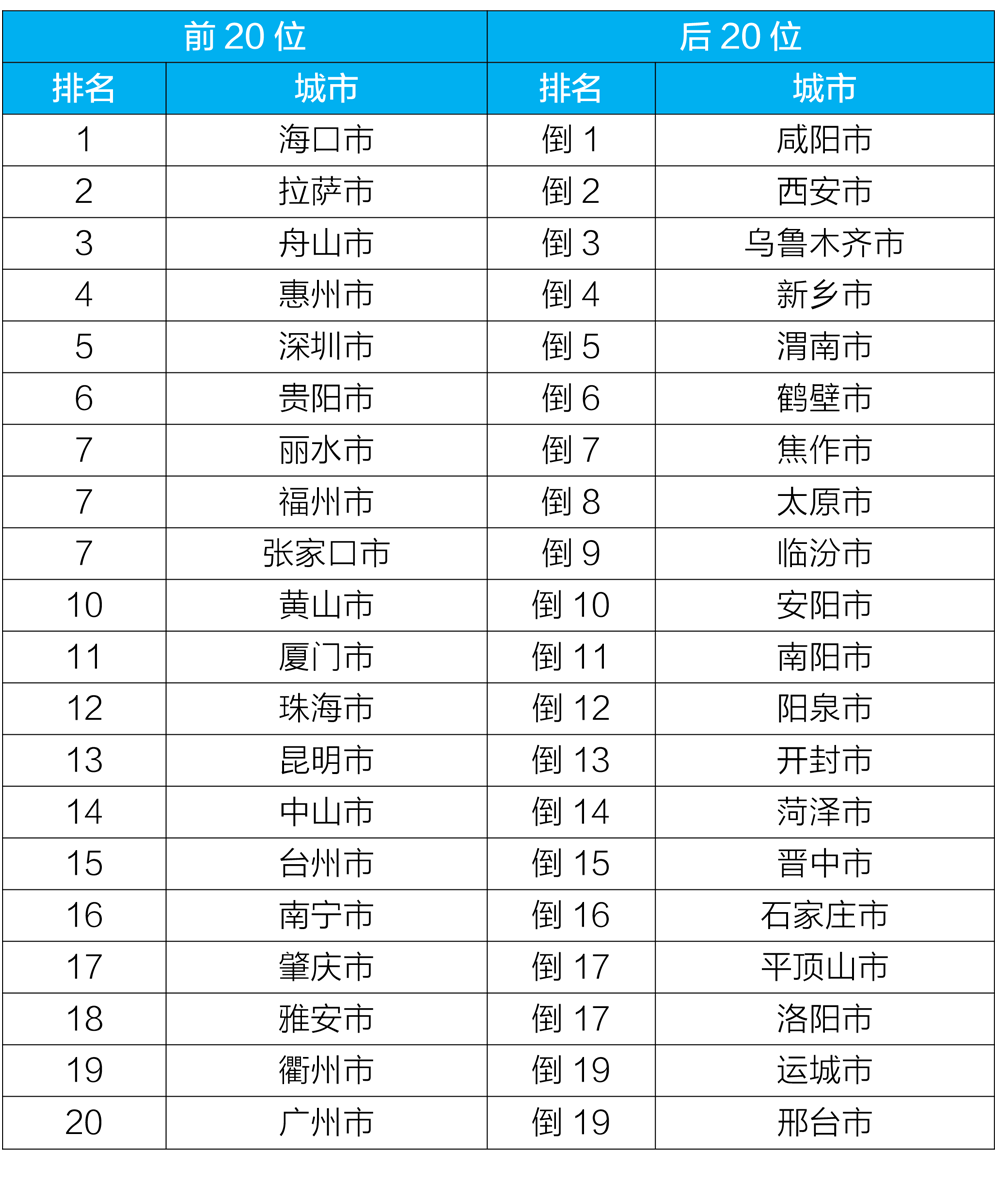 1—5月,168个重点城市中,海口、拉萨、舟山市等20个城市空气质量相对较好(从第1名至第20名);咸阳、西安、乌鲁木齐市等20个城市空气质量相对较差(从倒数第1名至并列倒数第19名),见附表2。