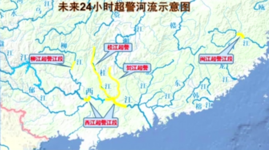 预计未来24小时,西江干流广西桂平江段及广西龙圩至广东德庆江段,广西桂江、贺江将维持超警,广西柳江、福建闽江可能超警,暴雨区内部分中小河流可能发生超警以上洪水。
