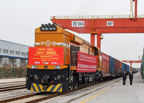 2022年2月18日,中欧班列(齐鲁号)中国青岛—德国曼海姆双向对开首班列车从上合示范区青岛多式联运中心出发。新华社发(王昭脉摄)