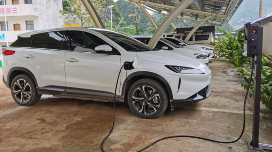 2022年5月9日,在广西大化县北景镇板兰村,一辆新能源汽车在充电。新华社发(张爱林摄)