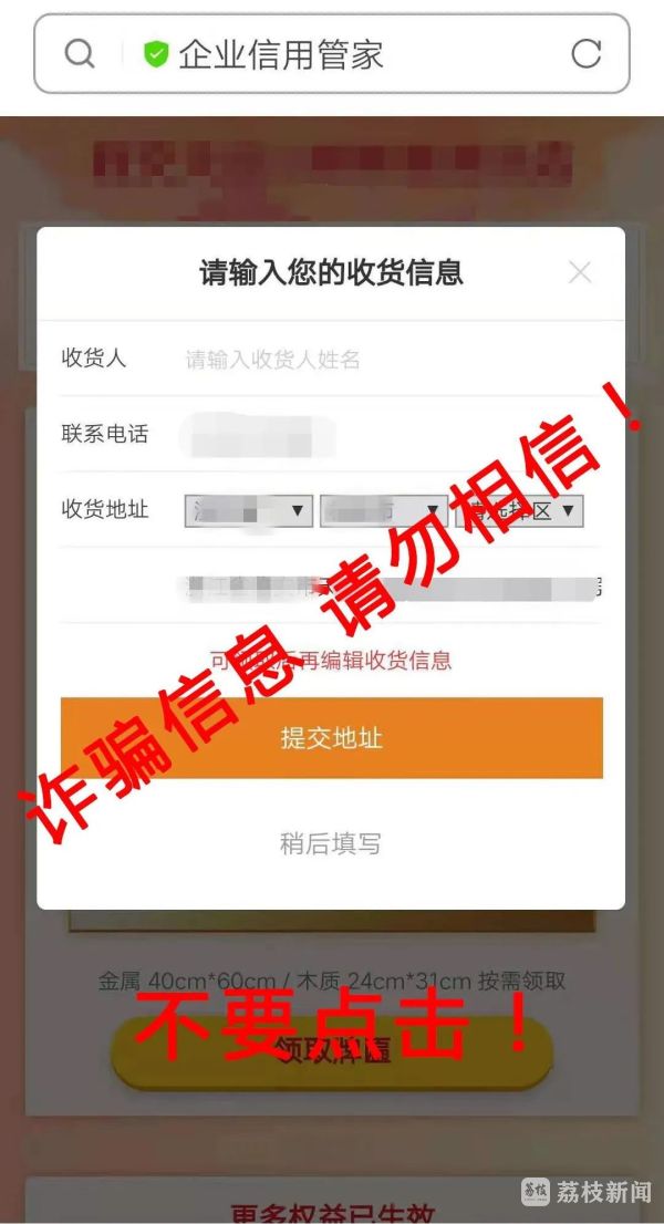同时为了看清诈骗的模式,执法人员还点开链接侦查了一番:点开链接以后,立马就出现了订单收费页面。这时候你要是点击立即核验,还会跳出一个填写收货信息的页面,煞有其事地让你填写收货人信息。