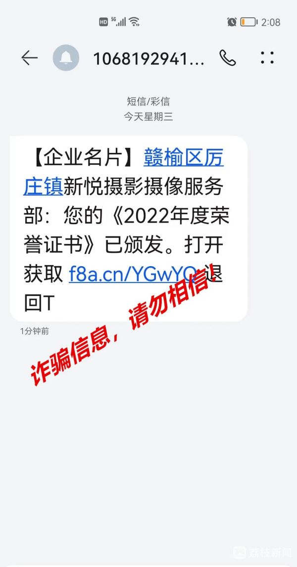 记者今天(6月18日)从连云港市场监管部门了解到,连云港赣榆区厉庄镇从事摄像服务的王先生,最近接连收到了2条这样的短信,78元就能拿到荣誉证书。王先生有点点心动,但也知道当前诈骗非常多,担心被骗。但他转念一想,统共就78元钱,诈骗根本不值当。由于店里比较忙,王先生准备抽空试一试,看能不能领到荣誉证书。