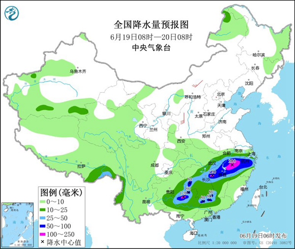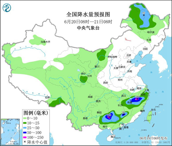 今起(6月19日)至下周初,南方大范围强降雨不下线,贵州、广西、江西、安徽及浙江等地累计雨量大,需谨防山洪、泥石流等次生灾害。与此同时,北方大范围高温天气来势汹汹,华北南部、黄淮不少地方可达40℃,局地或刷新6月气温极值,防暑工作不能放松。