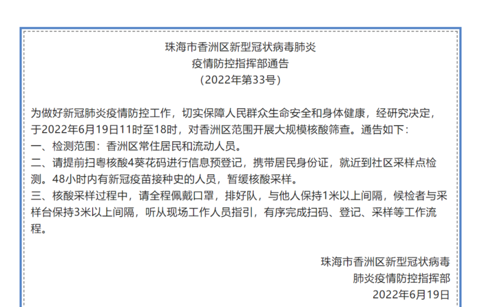 荔枝新闻讯 据“珠海香洲”微信号消息,为做好新冠肺炎疫情防控工作,切实保障人民群众生命安全和身体健康,经研究决定,于2022年6月19日11时至18时,对香洲区范围开展大规模核酸筛查。通告如下: