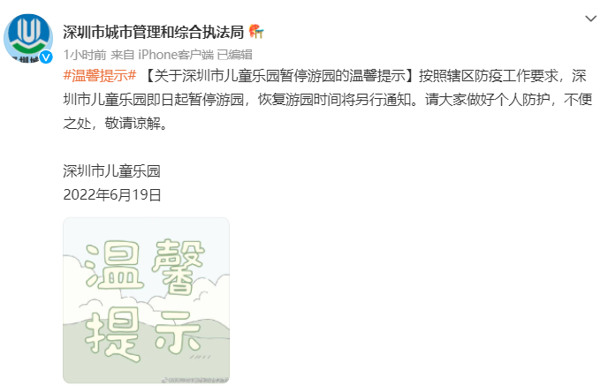 荔枝新闻讯 据“深圳市城市管理和综合执法局”微博消息,按照辖区防疫工作要求,深圳市儿童乐园即日起暂停游园,恢复游园时间将另行通知。请大家做好个人防护,不便之处,敬请谅解。