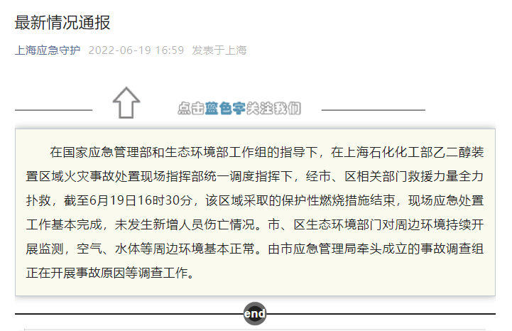 荔枝新闻讯 据“上海应急守护”微信公众号消息,在国家应急管理部和生态环境部工作组的指导下,在上海石化化工部乙二醇装置区域火灾事故处置现场指挥部统一调度指挥下,经市、区相关部门救援力量全力扑救,截至6月19日16时30分,该区域采取的保护性燃烧措施结束,现场应急处置工作基本完成,未发生新增人员伤亡情况。市、区生态环境部门对周边环境持续开展监测,空气、水体等周边环境基本正常。由市应急管理局牵头成立的事故调查组正在开展事故原因等调查工作。