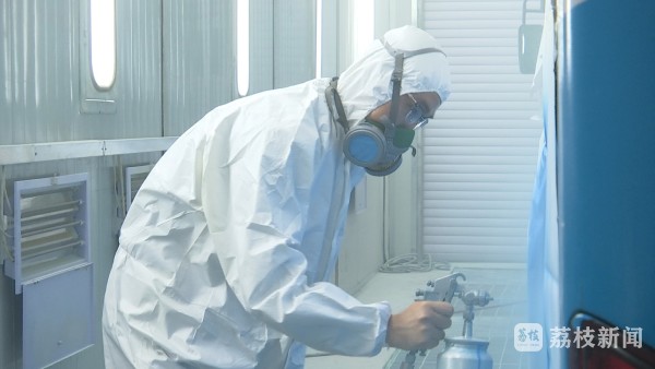 南京公交集团保修分公司一车间漆工杨帆身着工作服,外加一件防护服,在进行喷漆作业。短短一个小时,汗水就将他的衣服全部浸湿。
