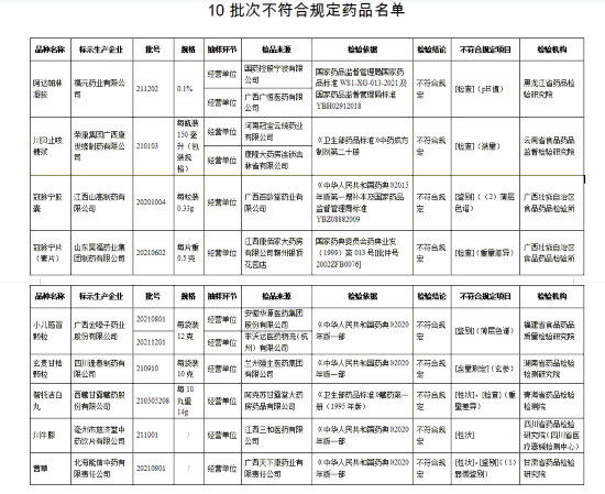 据国家药监局官网,经福建省食品药品质量检验研究院等8家药品检验机构检验,标示为广西金嗓子药业股份有限公司等9家企业生产的小儿感冒颗粒等10批次药品不符合规定。现将相关情况通告如下: